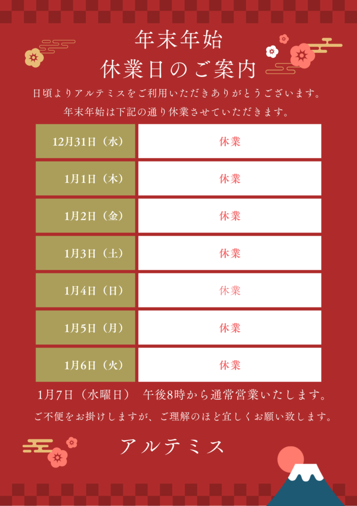平素よりご愛顧賜り、誠にありがとうございます。 年末年始のお知らせを申し上げます。 アルテミスは、12月31日(水)から1月6日(火)まで年末年始休暇とさせていただきます。